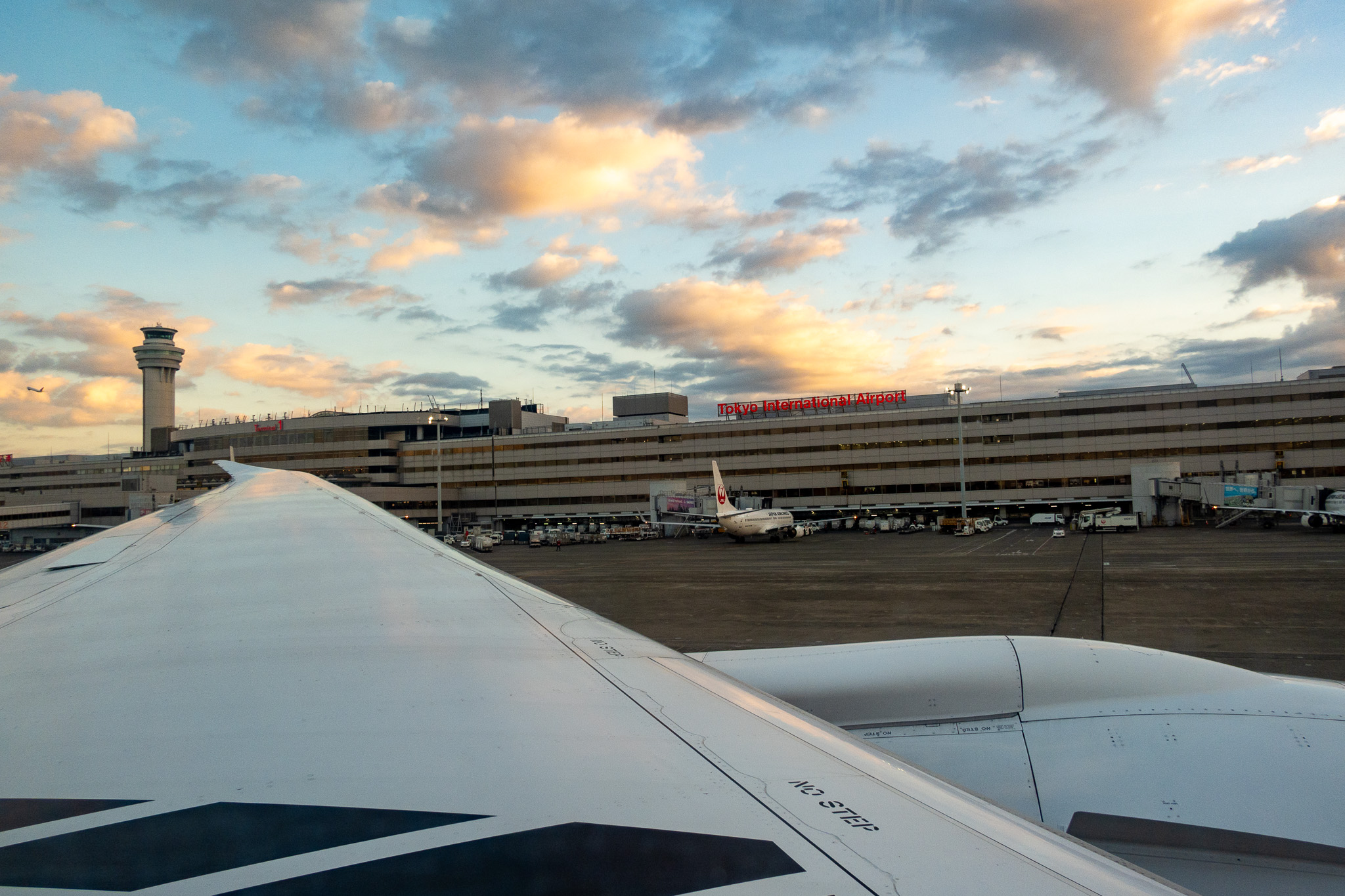 1/1早朝の羽田空港、プッシュバック後のターミナルと朝日に照らされた雲