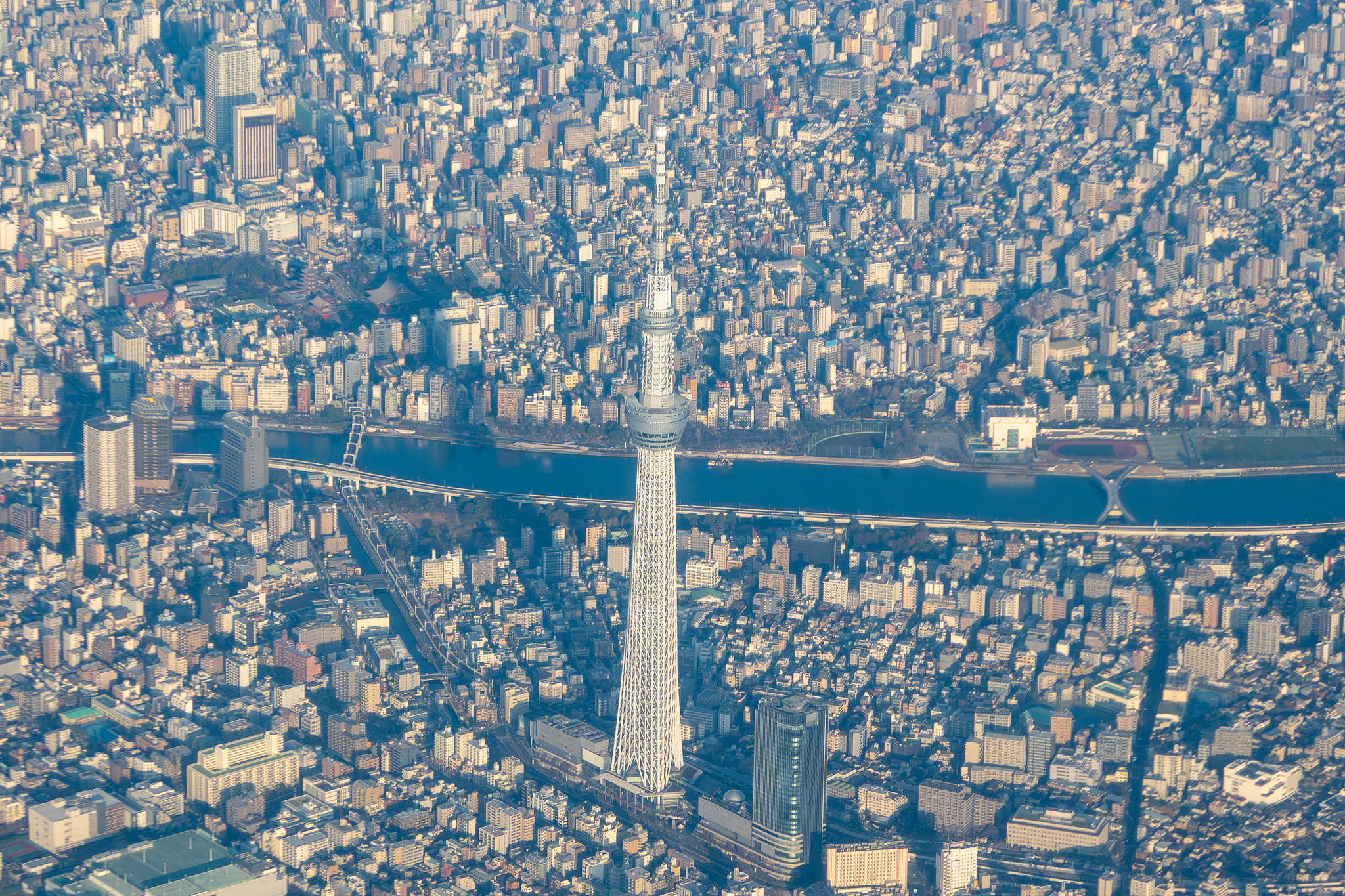 JAL565 羽田⇒女満別の機窓。羽田空港C滑走路を離陸し東京湾沿いから北に向かいスカイツリーへ。